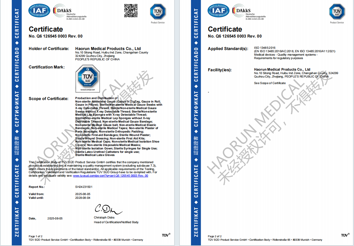 Ad longius augendae qualitas, ut complebitur publication nostra qualis manual et procedure documenta in Septembris MMXXIII. Ex hoc nos aucta nostra qualis administratione ratio documenta in January MMXXIV, addendo Mdr-related contentus. Nos transivimus primum scaena in TUV sud audit in April X, MMXXV et deinde secundo gradu. Denique in August huius anni, nostri libellum numerus factus available for viewing in notificatur corpus s ratio, notatis novum gradum deinceps in Haorun Medical scriptor qualis procuratio ratio et confortans comitatu est scriptor fundamenta. Nostrum PROMPTU Medical Medical Consumables (TELA, TELA Rolls, TELA Bandages, etc.) Provide Customers Worldwide cum Superior Product Quality et Service.